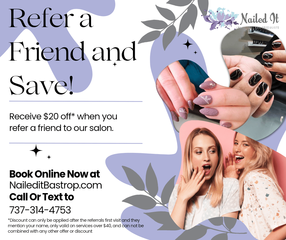 If you need help with scheduling we are happy to do so through calls or texts at 737-314-4753. You may also email jenny@naileditbastrop.com. Located at 1002 Chestnut St, Bastrop. TX 78602.